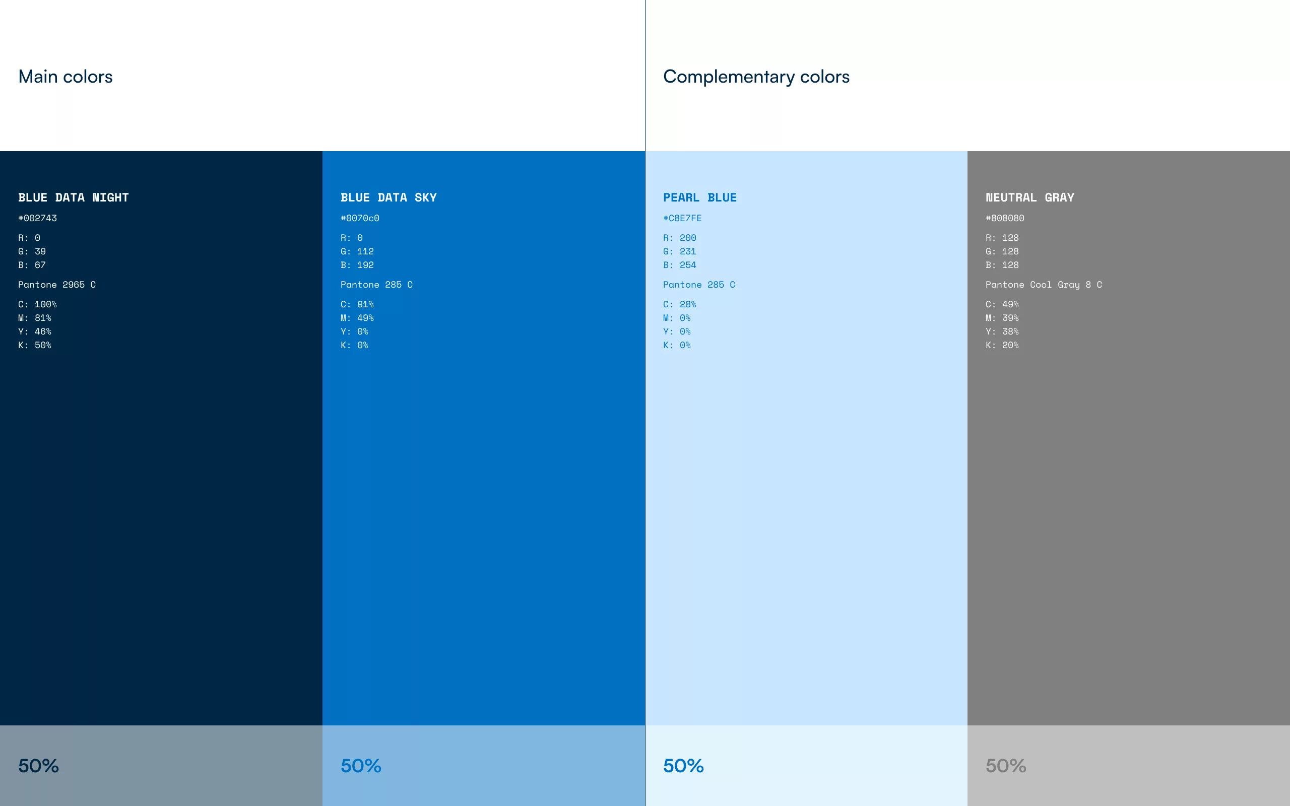 El logotipo presenta tipografía contemporánea con un recurso visual distintivo: trazos en un azul más claro que segmentan las letras «v», «r» e «i», creando un hilo conductor que sugiere conectividad y flujo de datos (un guiño al puente entre archivo físico y digital que caracteriza a la empresa). La paleta de azules corporativos fue seleccionada estratégicamente: estos tonos institucionales son sinónimo de seguridad y confiabilidad en el sector de gestión de información sensible.